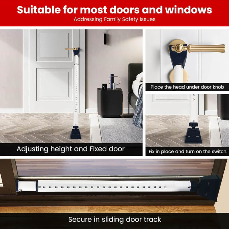 The alarm door security bar adjusts from 29 inch - 45 inch for application flexibility. With an adjustable and versatile design, the door security bar fits most sliding and hinged doors. Whether you use a security bar for a hinged, sliding door or Window, you can be assured that the design features of the security bar are optimized to keep your family safe.