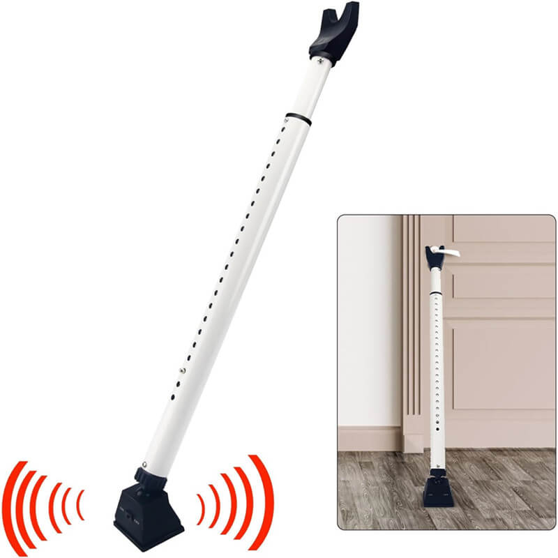 This alarm door security bar is constructed of high-grade iron to withstand 400 pounds of pressure. The pivoting ball joint ensures the door stopper has full contact with the floor and the padded foot provides a strong grip without scratching.