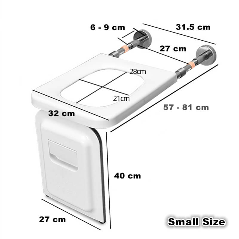 This folding wall-mounted toilet chair can be folded freely and stowed away during non-use, so as not to take up space in the bathroom; it can also be retracted freely without any limitation of space.