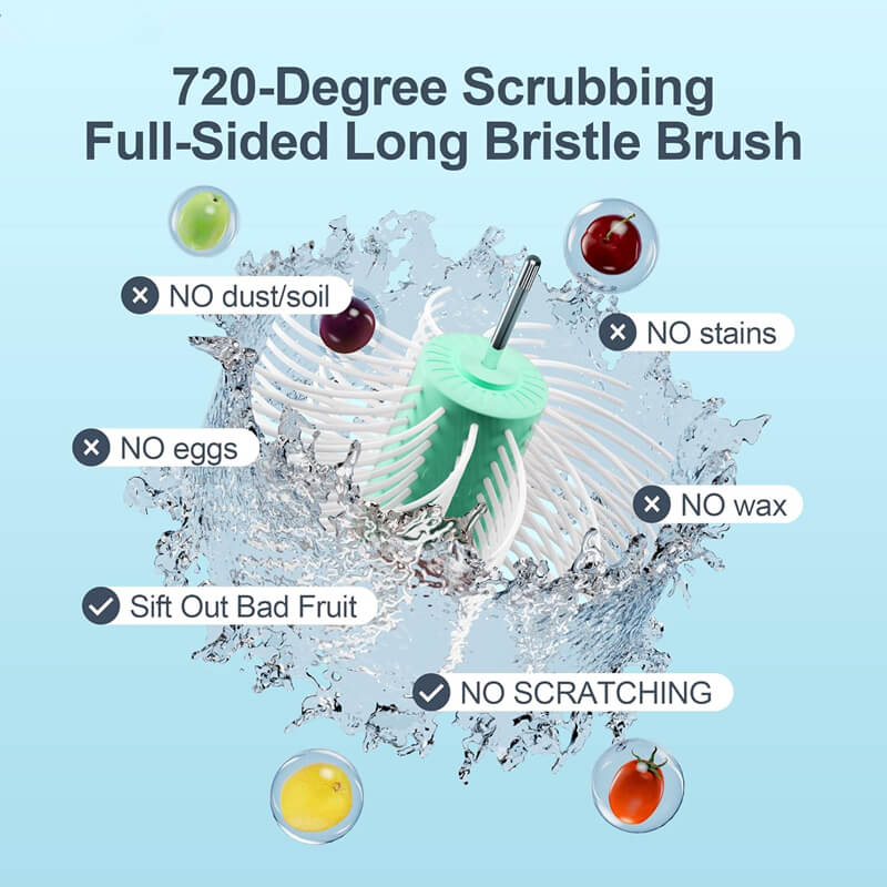 The soft TPE-handle and long bristles turn over every single fruit repeatly, thus providing 720-degree scrubbing from all directions. Brush can safely remove any dust, soil, wax, stains and reduces agricultural chemicals or harmful residue on the fruits without scratching the fruits.
