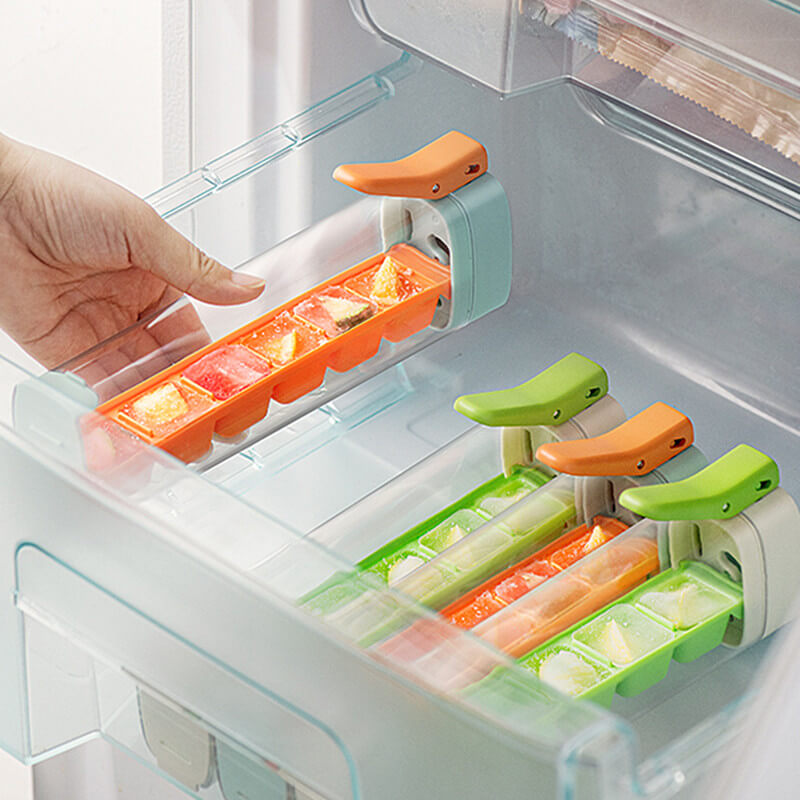 Our upgraded ice cube tray for freezer features an innovative one-button easy release design making it different from traditional ice cube trays. To release the ice, simply press to release the ice cubes. No more troubles to take out ice cubes.