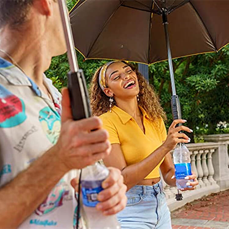There is a fan built into the center of the umbrella, which can provide strong wind. It also supports spray function, works by screwing in a water bottle to the bottom of the handle and squeezing the mist spray button. Guaranteed to fit all kinds of water bottles in the market.