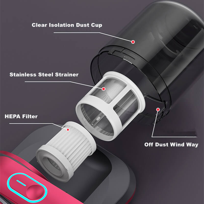 Our wireless mite cleaner HEPA filter deeply purifies, captures 99.99% of particles as small as 0.3 microns, and releases fresh air. Isolate large particles of garbage, firmly lock dust and dirt, and will not leak.